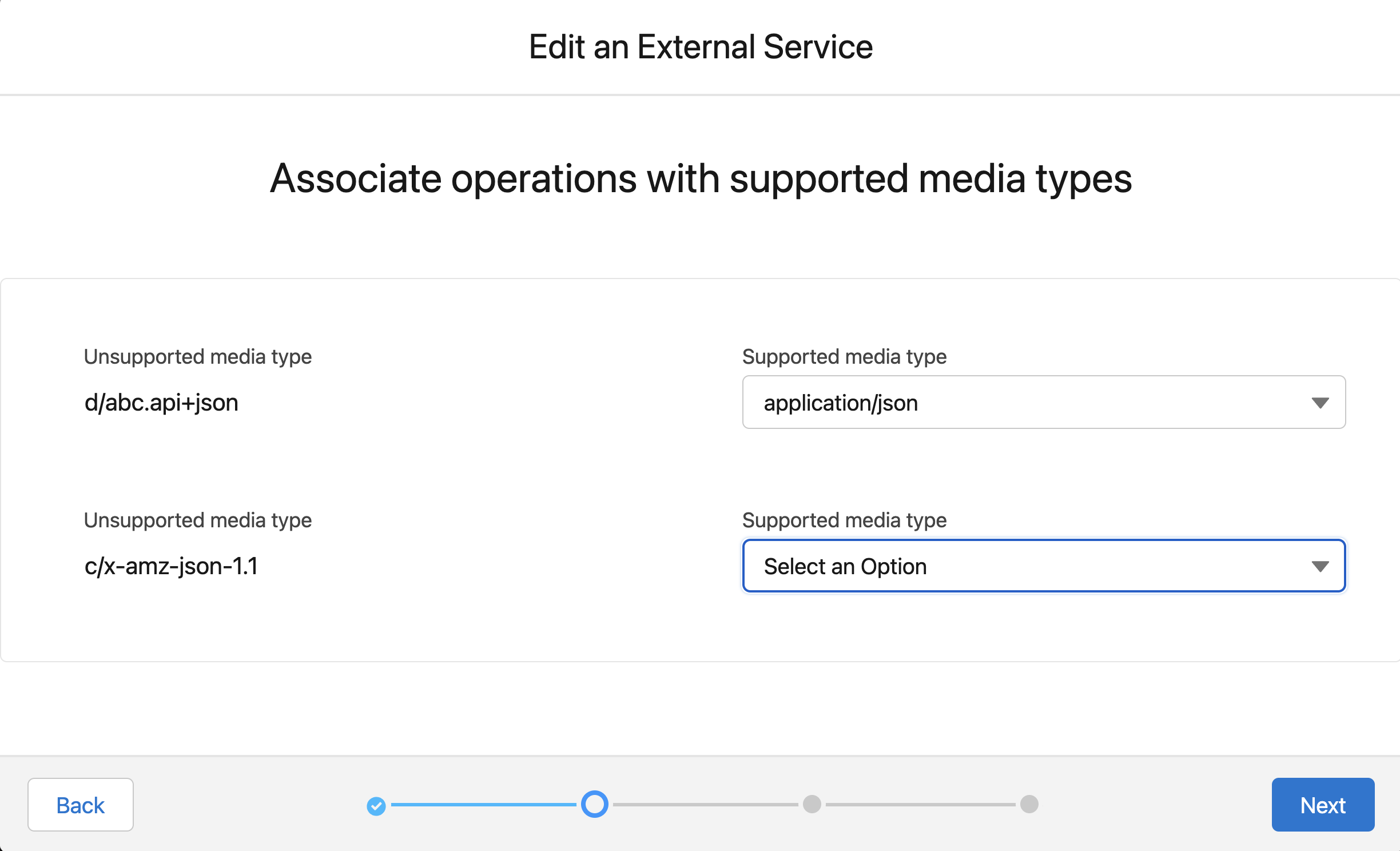 Say you want to callout to an AWS API that utilizes a specific media type such asapplication/x-amz-json-1.1.which we do not support because it doesn’t adhere to OpenAPI specification standards, and therefore, doesn’t comply with the requirements of External Services. Previously, developers needed to provide the mapping with code by using the Metadata API, but now the External Services registration screen has been enhanced to allow you to easily select a valid mapping from a dropdown menu for each unsupported media type. Additionally, this is something our trailblazers have been asking for on the IdeaExchange!