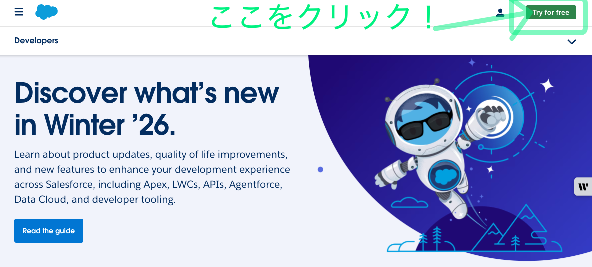 1. Salesforce Developer サイトにアクセスし、[Try for free] ボタンをクリックします。(見つからない場合は直接こちらの URL をクリックしてください。)