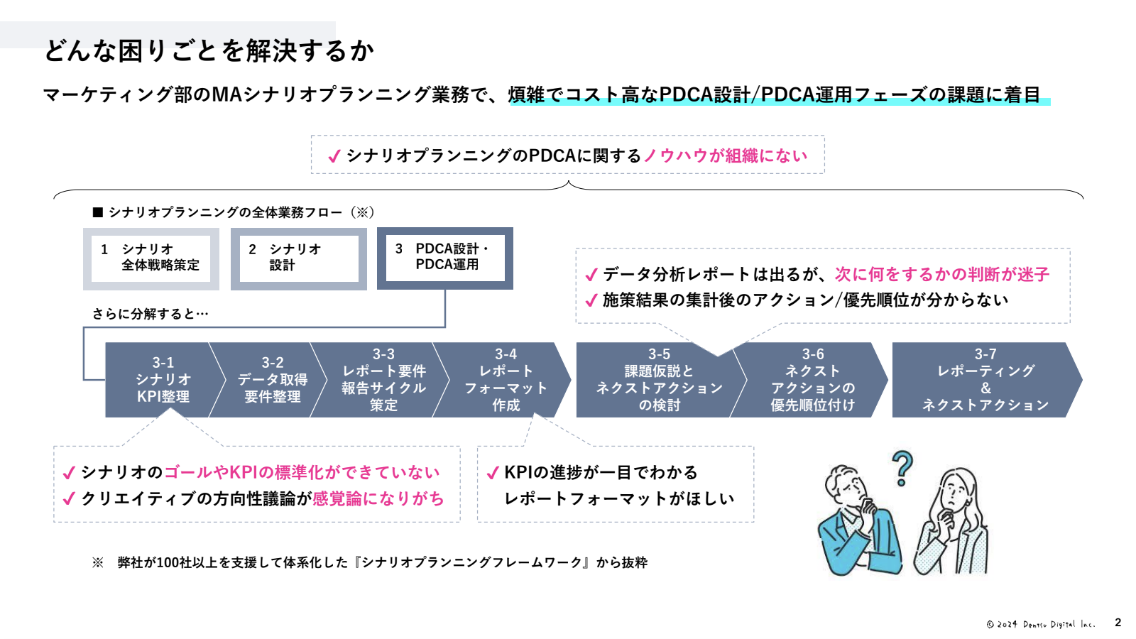 多くの企業が MA(マーケティングオートメーション)ツールを導入していますが、現場のマーケターは「シナリオプランニング」とその後の「 PDCA 」において深刻な課題を抱えています。チーム電通デジタルは、自社の 100 社以上の支援実績から、以下の「現場のリアルな悩み」に着目しました。