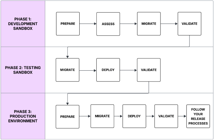 Migrating from the Omnistudio managed package runtime to the standard runtime is a three-phase process. It starts in your development sandbox, where you set up and install the OMA tool, then moves on to your testing sandbox, where the OMA validates the components, and finally ends with your production environment, following your release cadence.
