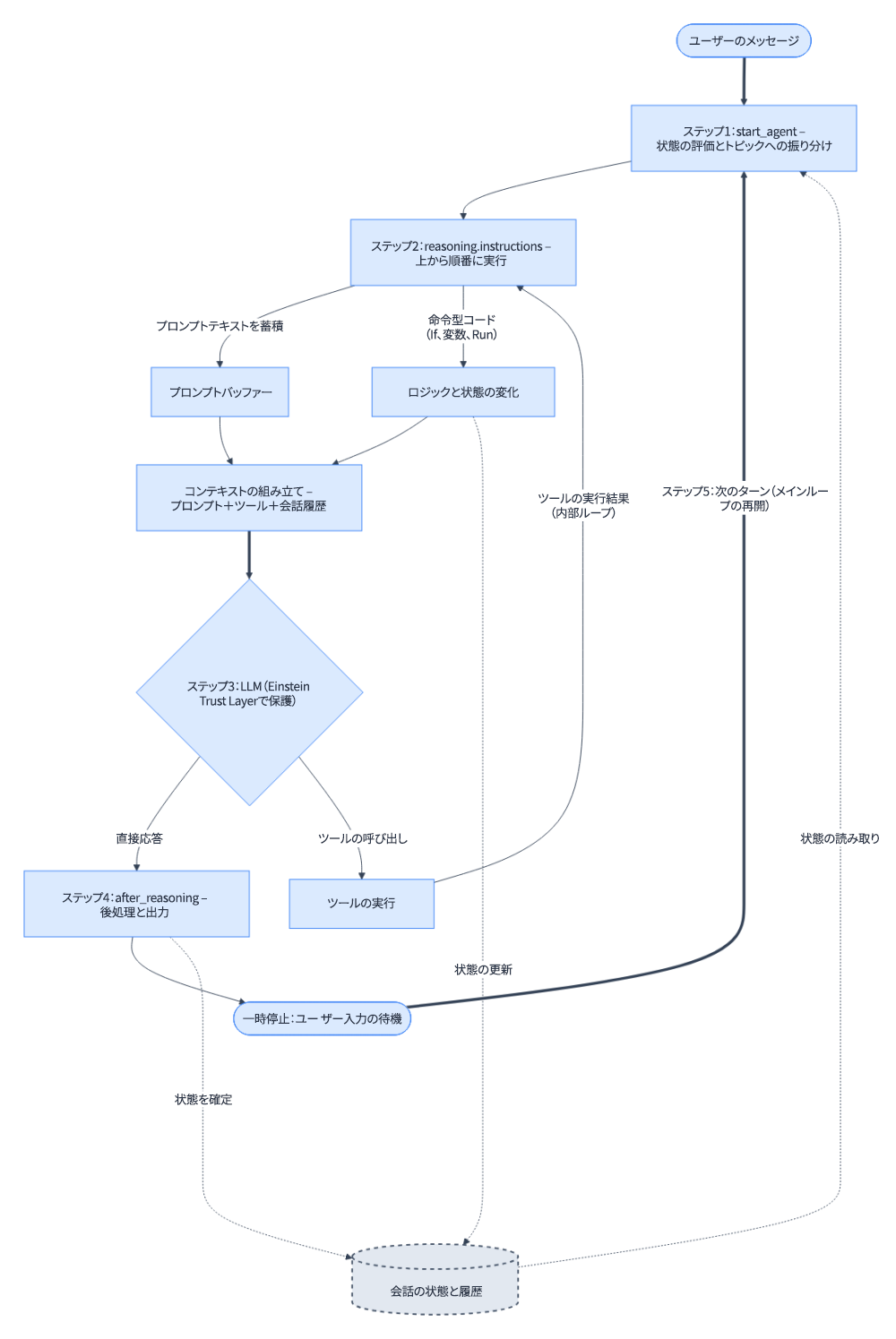 ステップ3 – 組み立てられたプロンプトと利用可能なツールが、Einstein Trust Layerによって保護された大規模言語モデル(LLM)に渡されます。ここで、決定論的な処理から非決定論的な推論に実行が切り替わります。Einstein Trust Layerによって保護されたLLMは、instructionsフェーズで蓄積されたプロンプトテキスト、会話履歴、reasoning.actions(英語)のツール一覧を受け取り、その情報をもとに推論を行います。LLMは直接応答することもあれば、ツールを呼び出すこともあります。このフェーズを確実に予測することはできませんが、入力された情報(組み立てられたプロンプト)を確認することで、LLMがなぜそう推論したかを理解できます。ツールが実行されるたびに、システムはステップ2に戻ってプロンプトを再評価します。LLMがツールを使わずに直接応答するまで、このサイクルが繰り返されます。