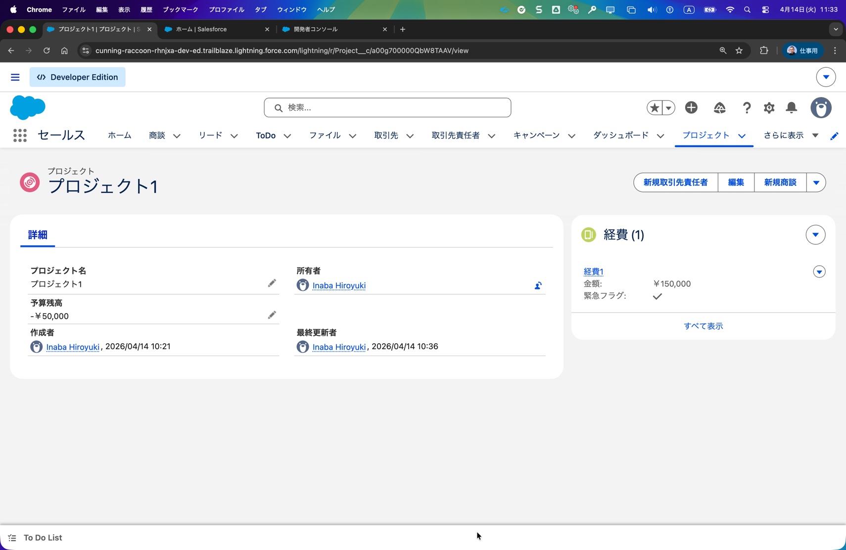 - 関連リストには「経費名」「金額」「緊急フラグ」の各項目が表示されている必要があります。
