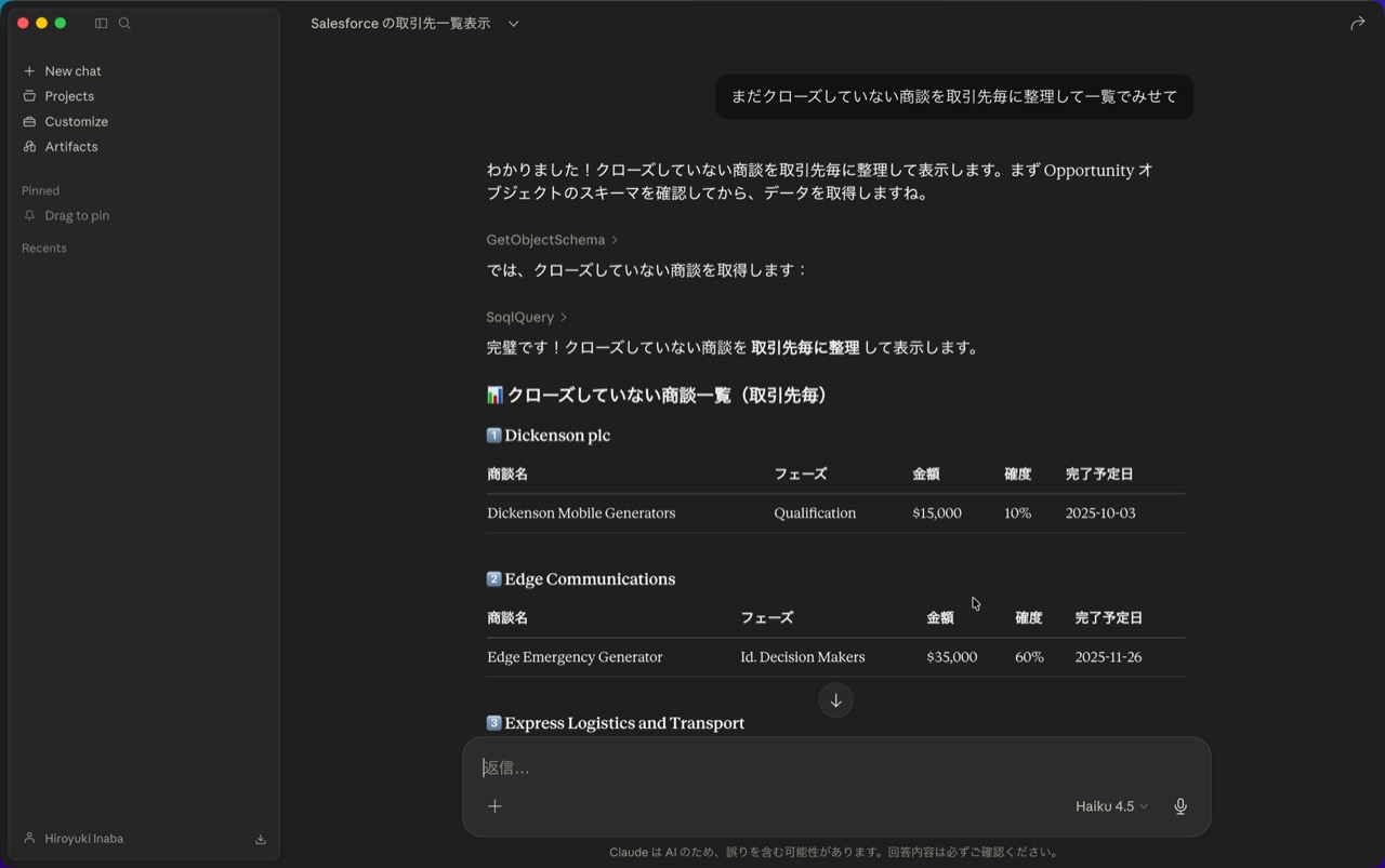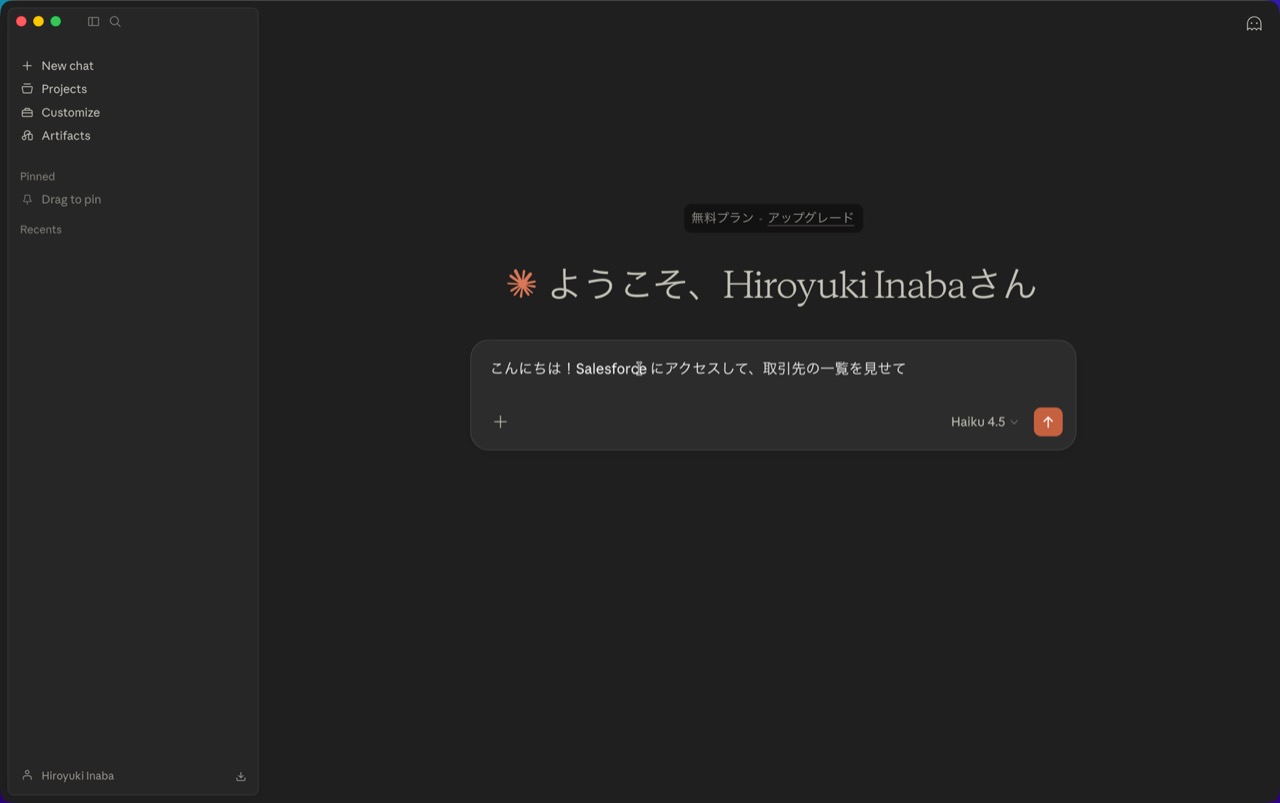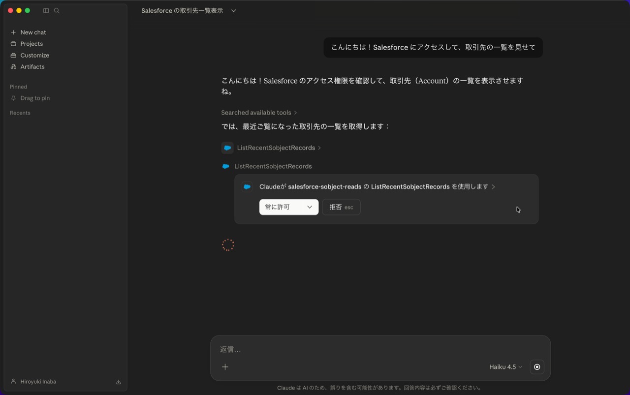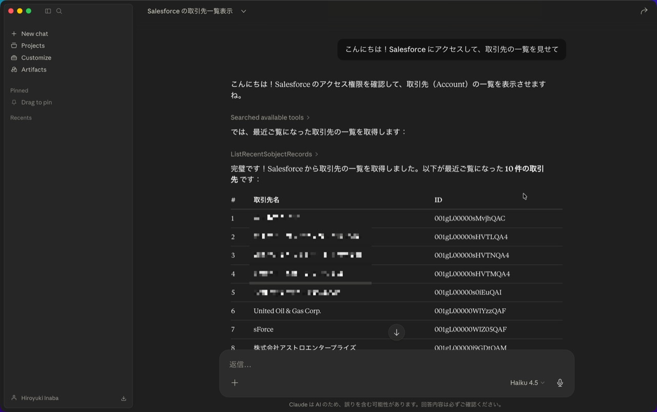 - 「こんにちは!Salesforce にアクセスして、取引先の一覧を見せて」
