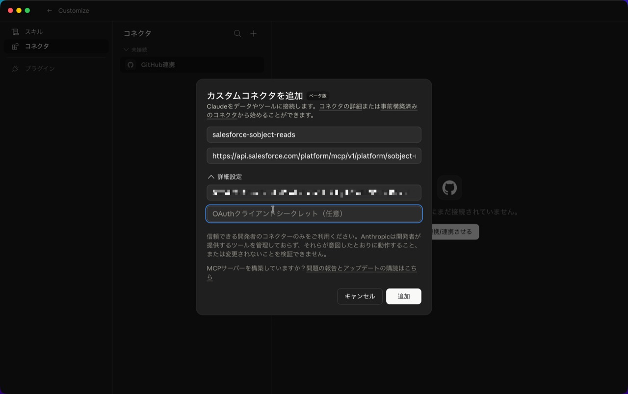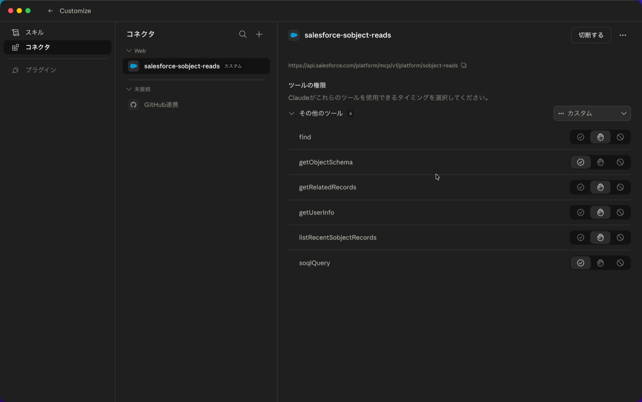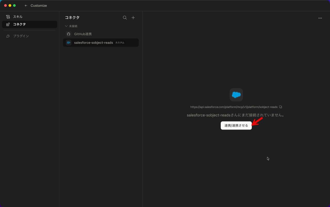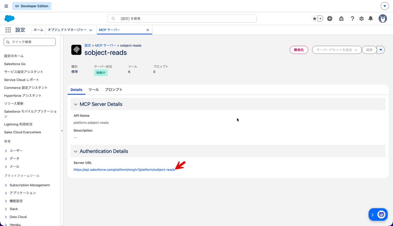 - URL は Salesforce の設定画面にある MCP サーバーの Server URL を指定