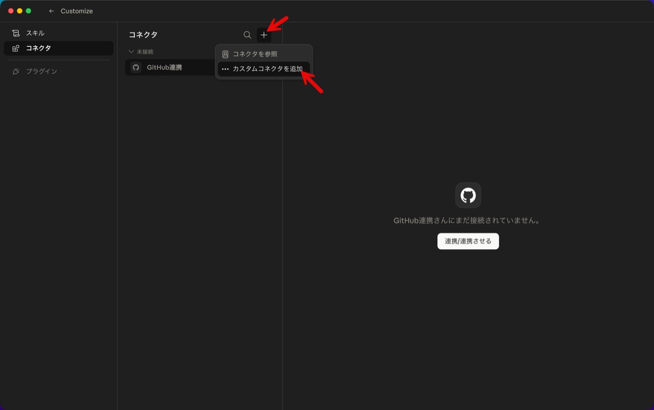 - カスタマイズ -> コネクタ -> 「+(追加ボタン)」 -> 「カスタムコネクタを追加」を押す