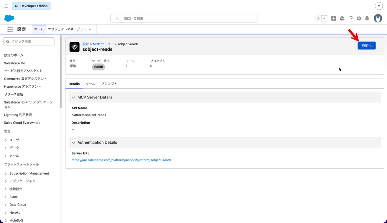 提供する機能によってサーバーが分かれています。ここでは「sobject-reads」を有効化して使用できるようにします。