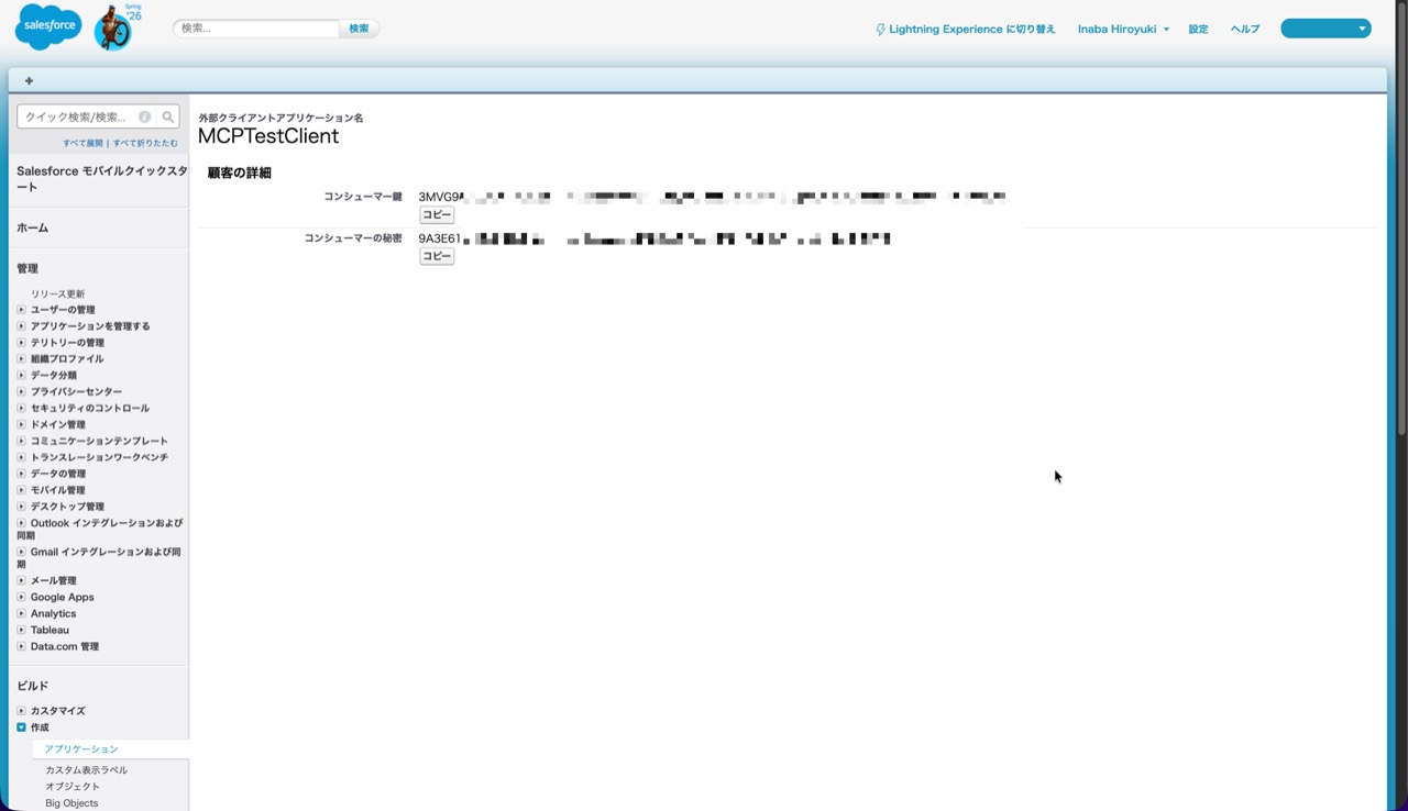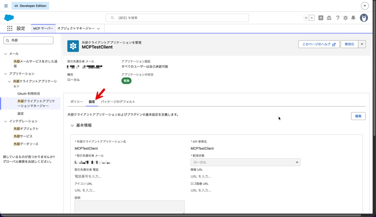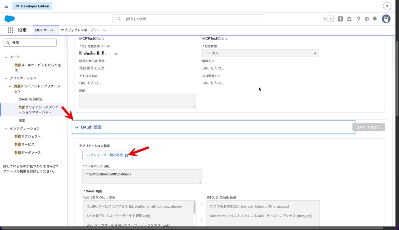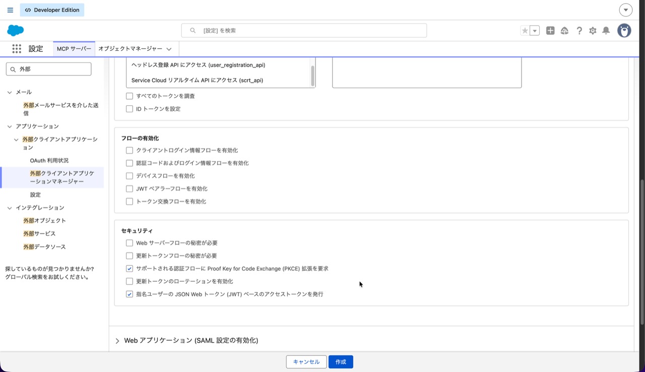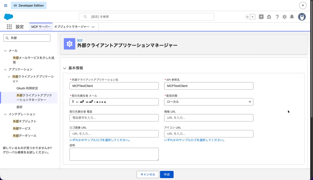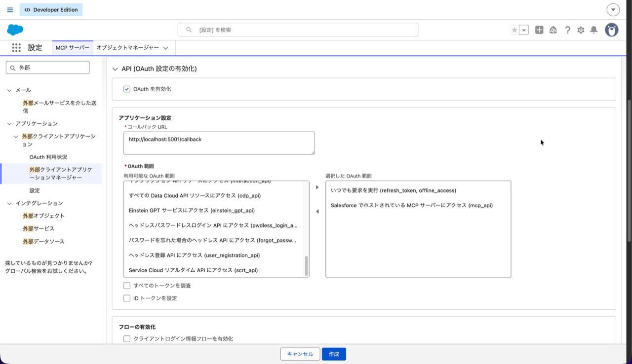 まずは、MCP クライアントからのアクセスを Salesforce で認証・認可できるように外部クライアントアプリケーションを作成します。