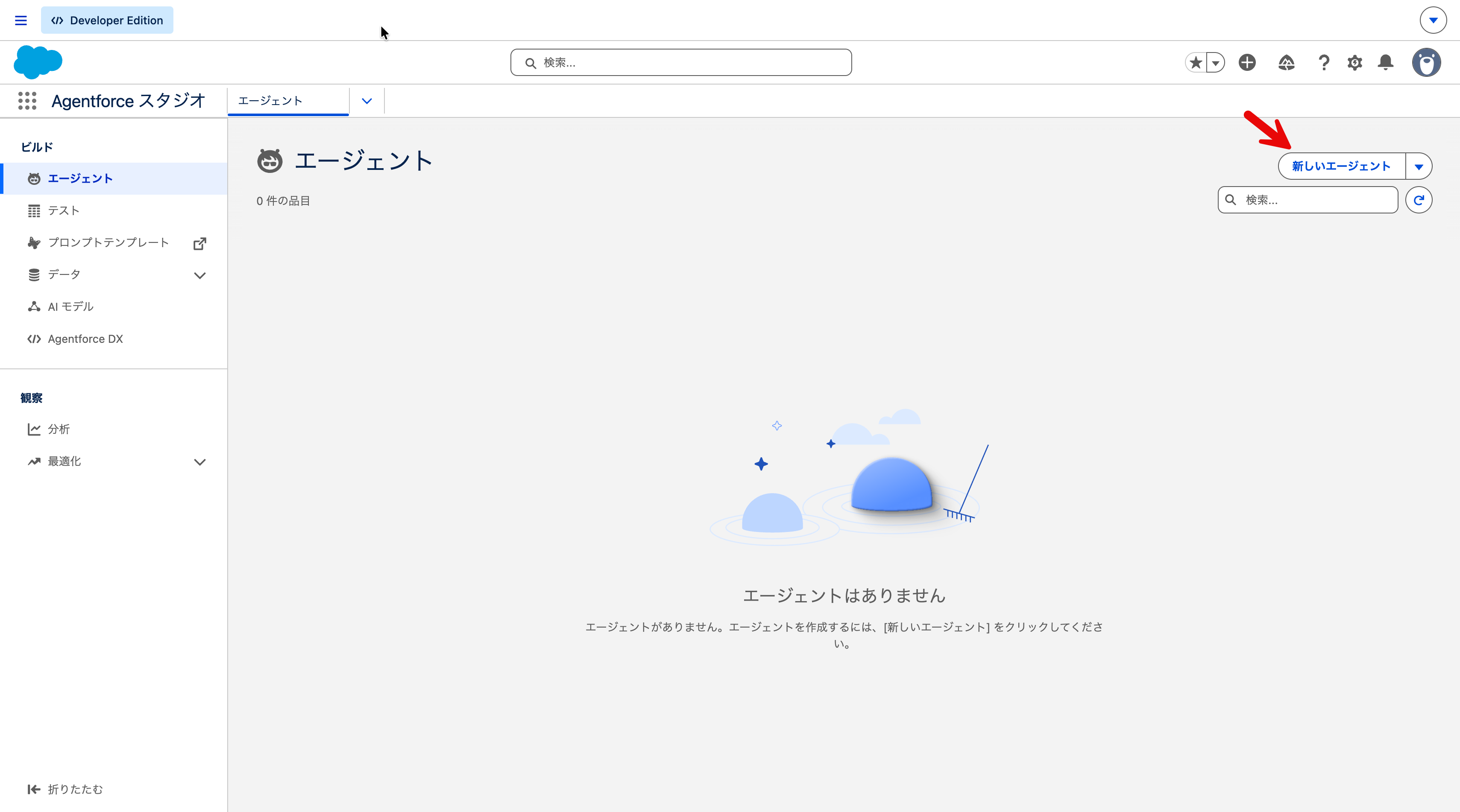 対処: 設定画面で Agentforce エージェントが有効になっているか確認してください。Developer Edition では標準で無効化されています