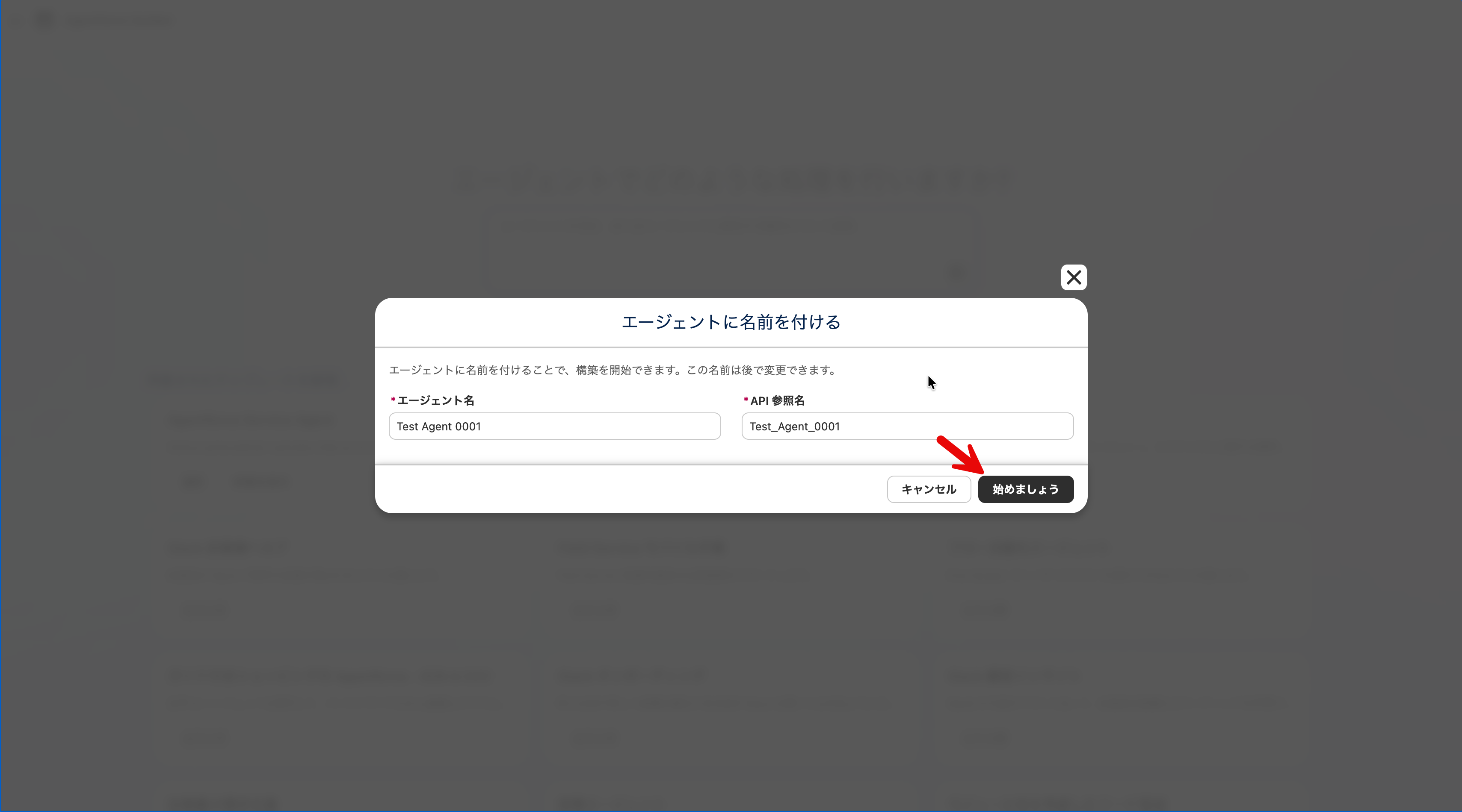 - 「エージェント名」と「API 参照名」を入力し、「始めましょう」をクリック