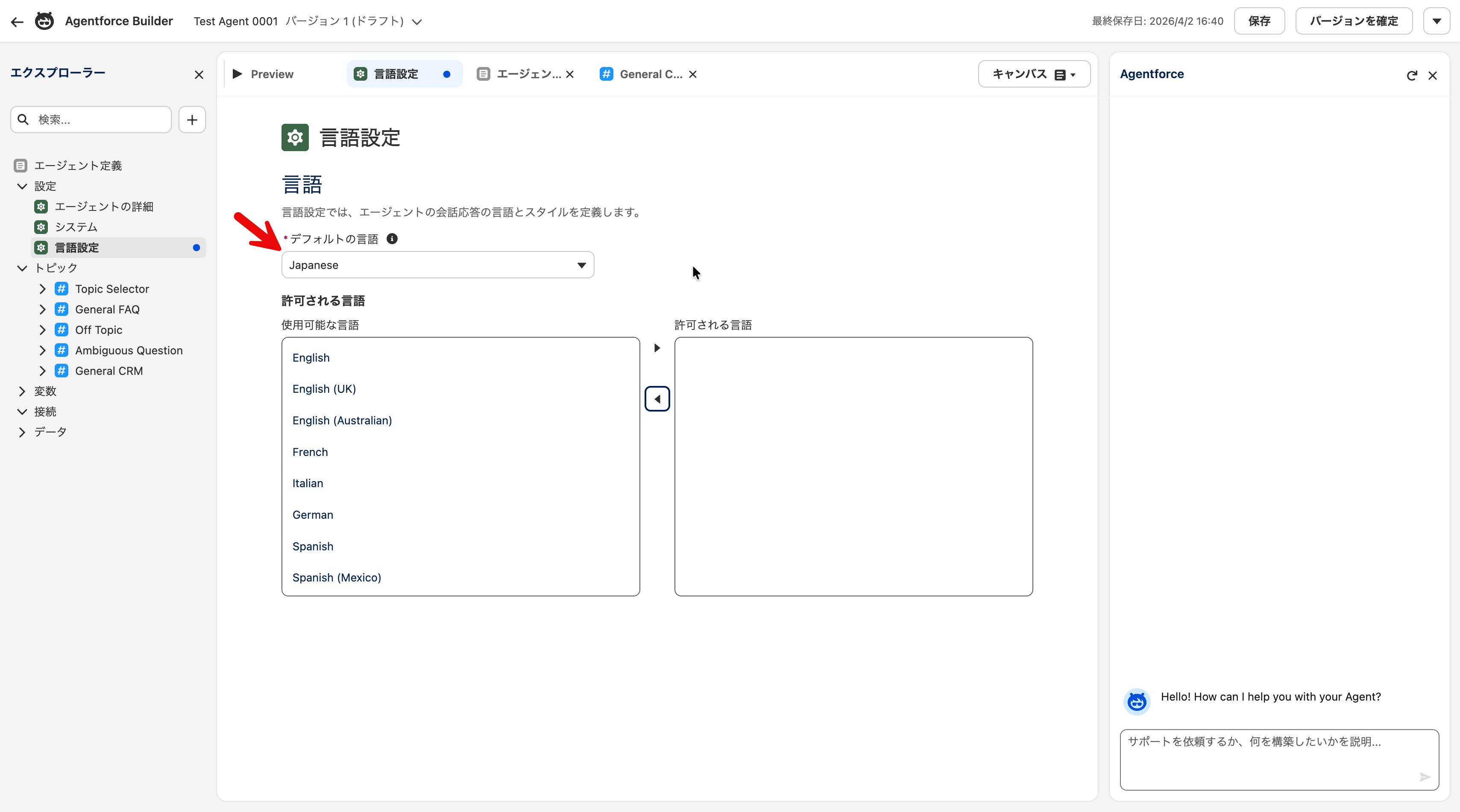 ※ 作業中はこまめに保存することをおすすめします。Agentforce Builder では、保存しないまま画面を離れると変更内容が失われる場合があります。