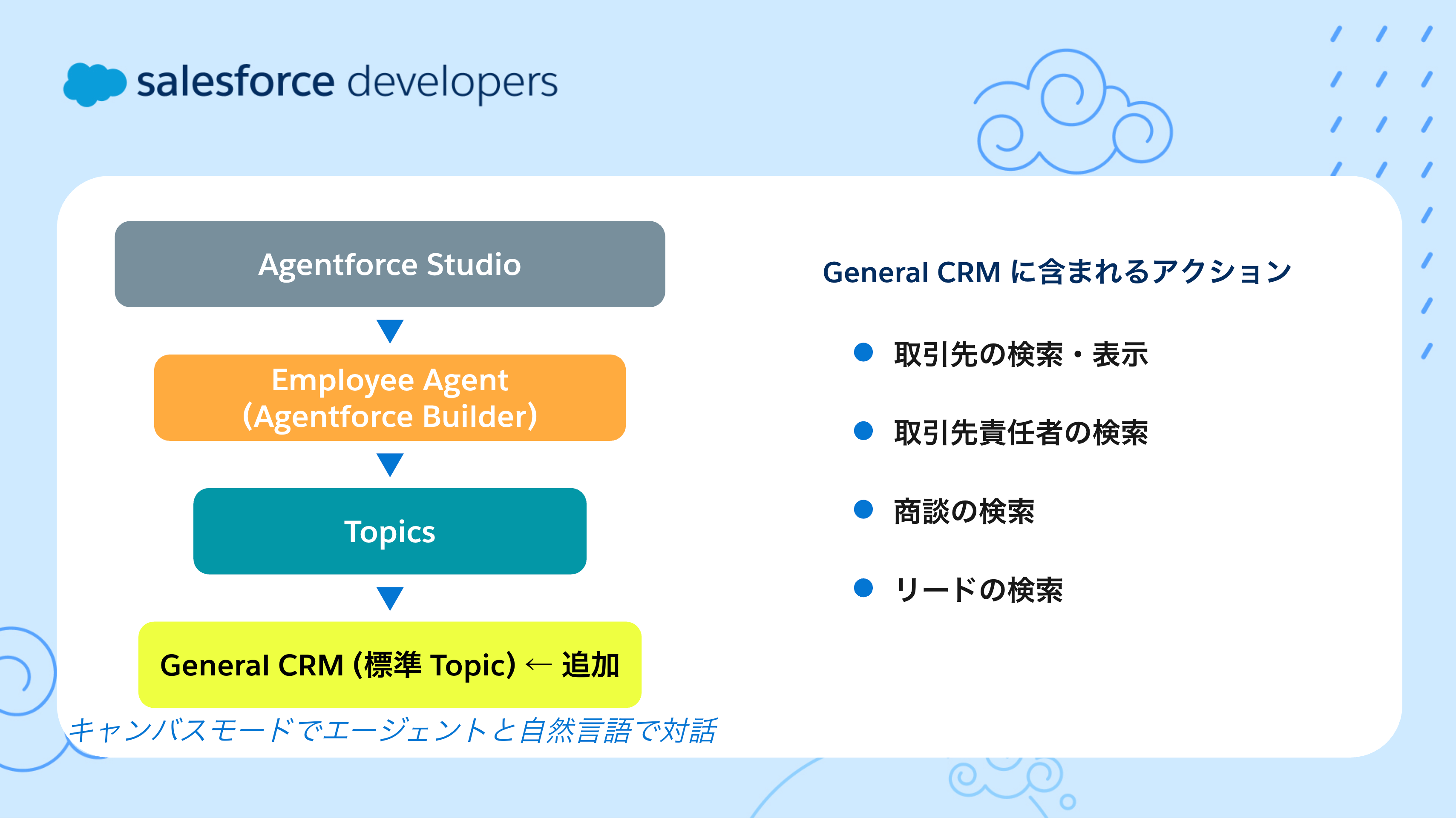 今回は標準の General CRM トピックを使いましたが、Agentforce ではさらに高度なカスタマイズが可能です。
