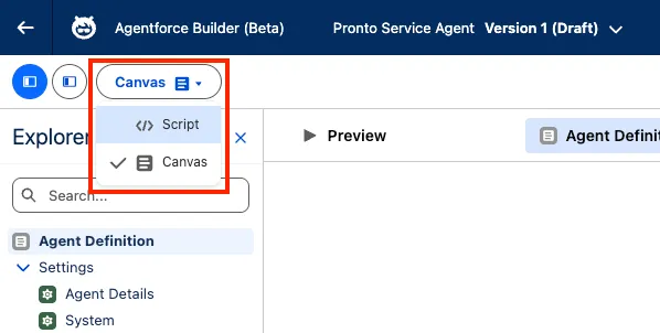 Click on Canvas, then select Script. This opens the agent configuration in Agent Script. Based on your preference you can work either in the canvas, or in script mode.