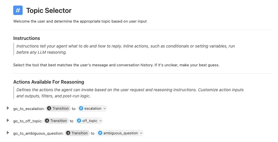 - Route conversations with a Topic Selector that hands off to the correct topic.