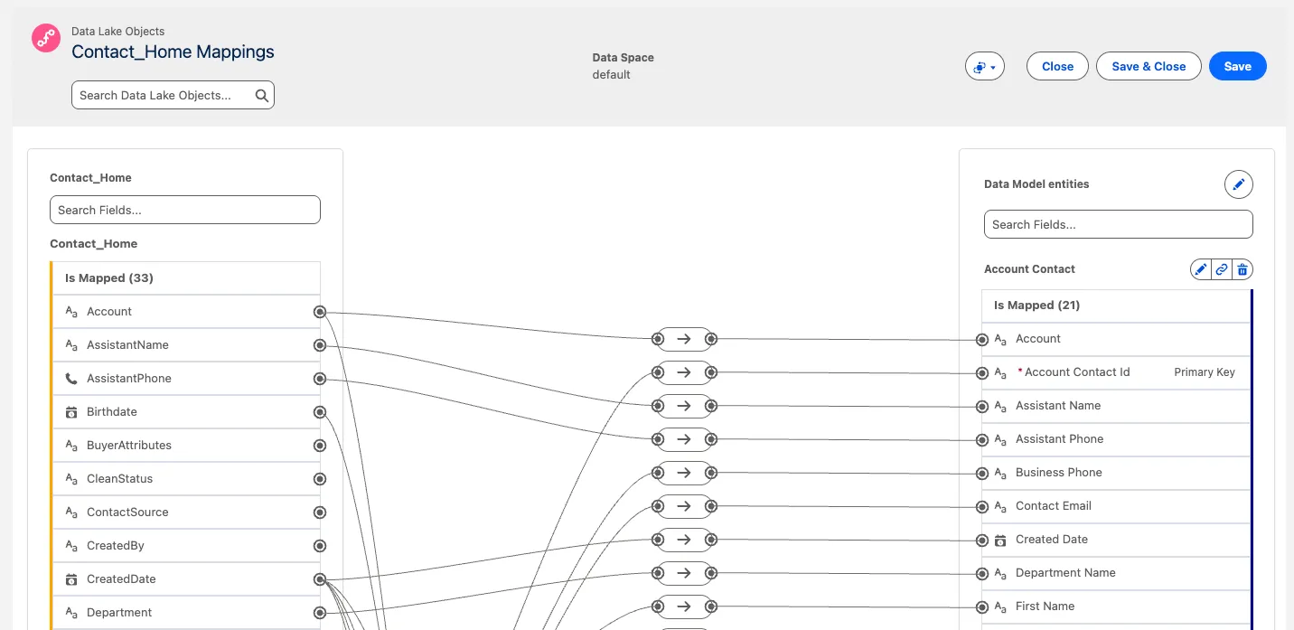 Review the Source object on the left-hand side: these are the fields of the Salesforce Contact object that you ingested into a data lake object (DLO).