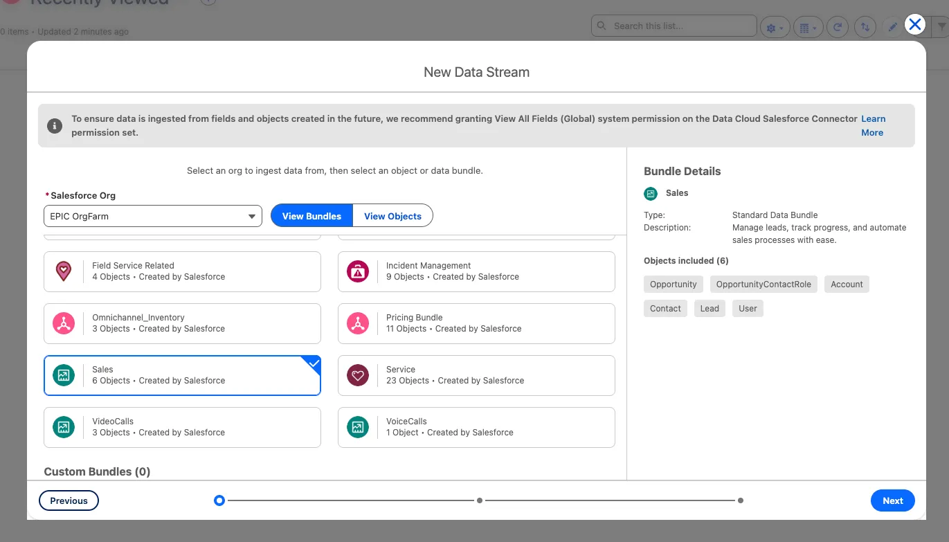Using an object bundle helps you ingest a related set of objects together. For the Sales bundle, you’ll see standard fields and relationships for Account, Contact, Lead, Opportunity Contact Role, and User.