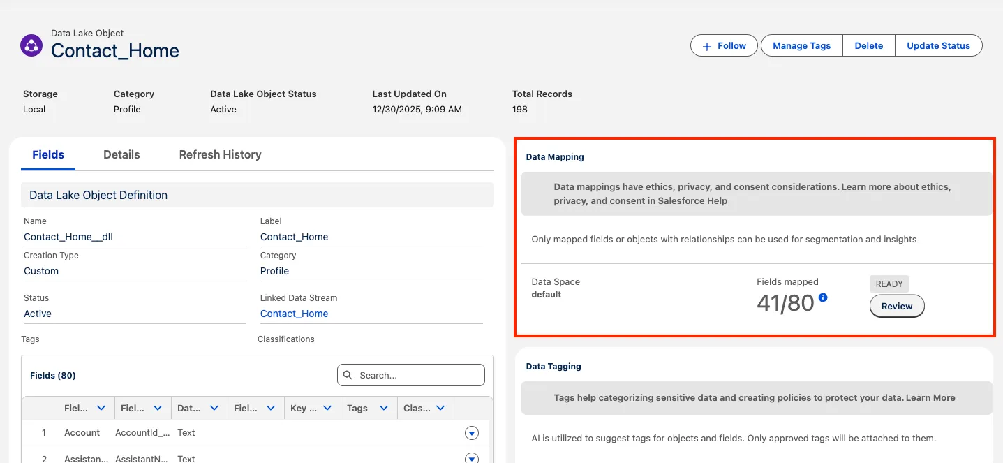 From the Contact_Home data lake object, click the Review button in the Data Mapping panel on the right.