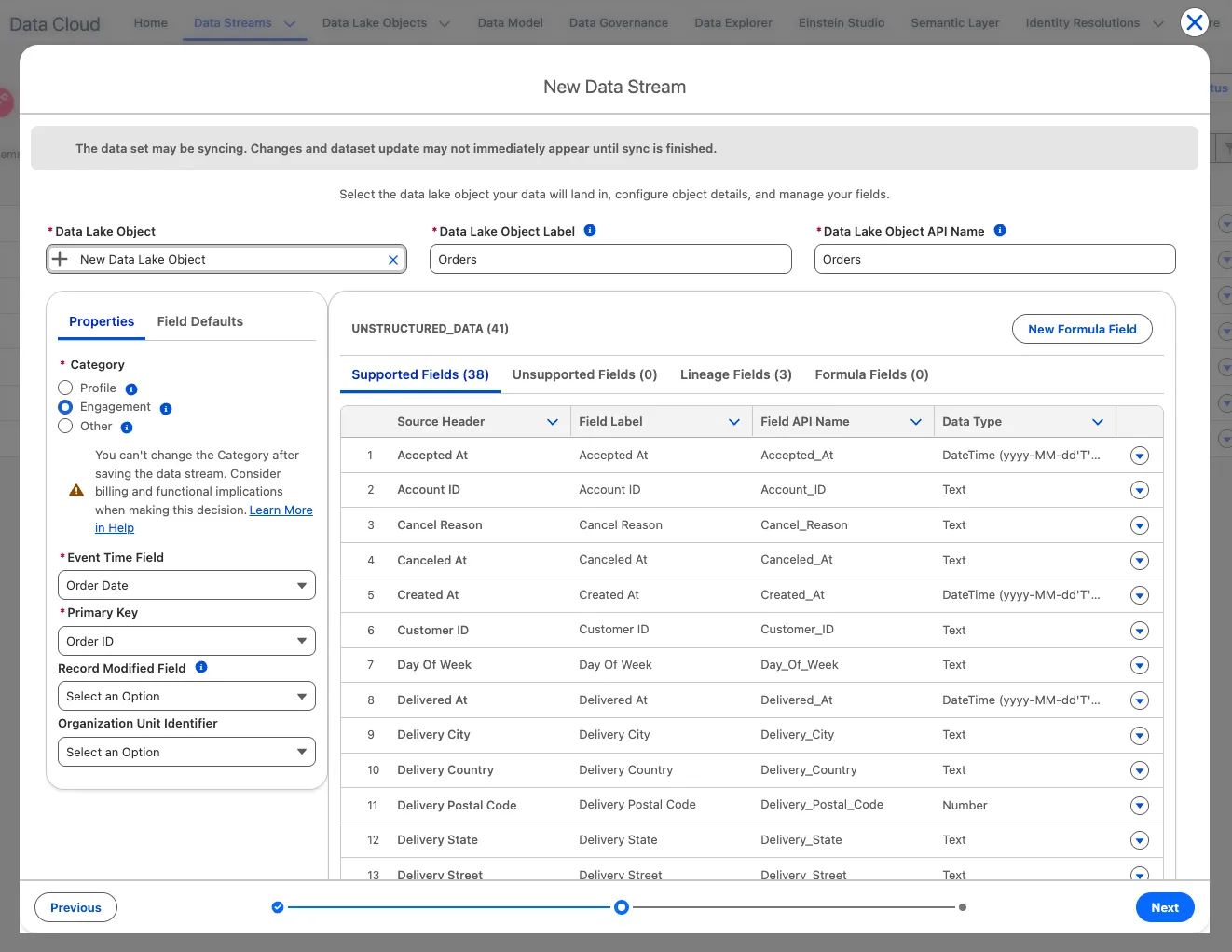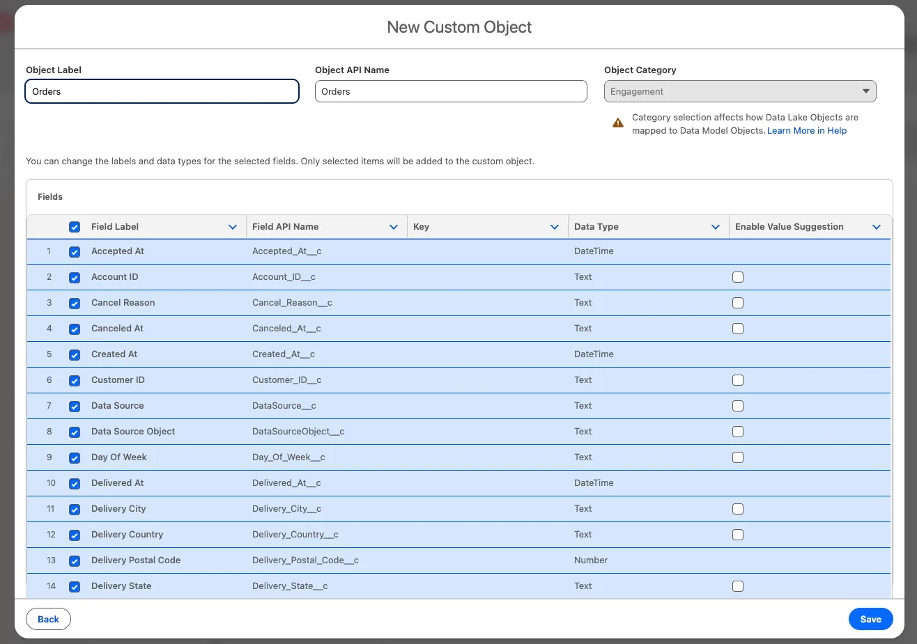 Field Value Data Lake Object Label OrderData Lake Object API Name Keep default Set the properties: