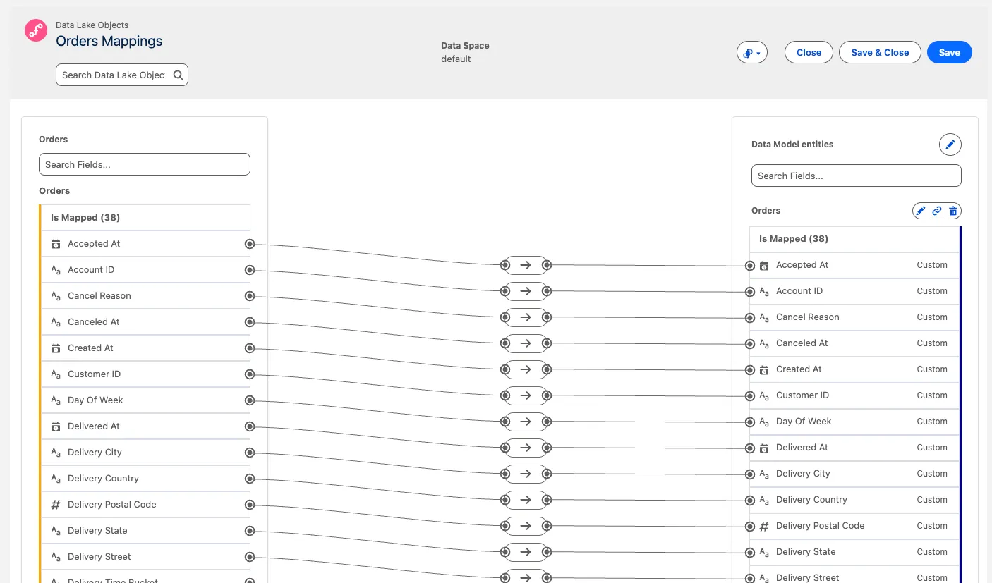 Examine the mappings. Because the Order custom data model object (DMO) was created based on your Orders data lake object (DLO), each field in the data lake object has been automatically mapped to its corresponding field in the data model object.