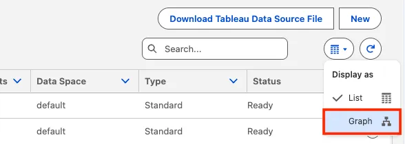 To visualize the new relationship, click the Data Model tab, click the Display as menu icon, and select Graph.