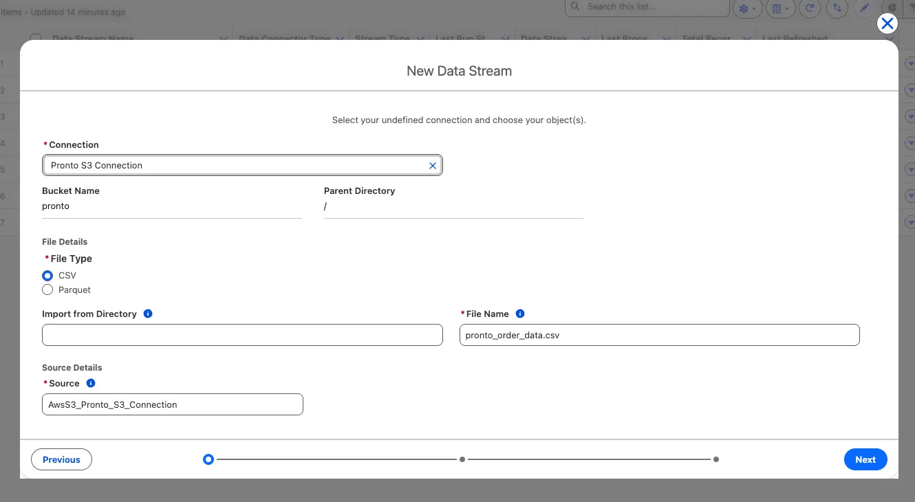 Field Value Connection Pronto S3 ConnectionFile Type CSVImport from Directory Leave blank File Name pronto_order_data.csvSource Leave the default value: AwsS3_Pronto_S3_Connection