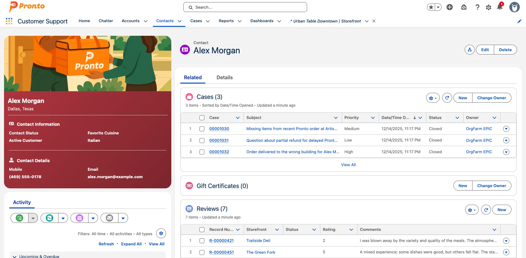 On the contact record, review the related lists and history (for example: Cases, Gift Certificates, and Reviews).
