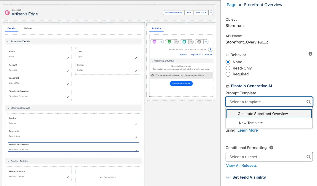In this exercise, you created and activated a Field Generation prompt template that generates a Pronto storefront overview. You previewed the template using a Storefront record and bound the template to the Storefront Overview field so users can generate content directly on the record page.