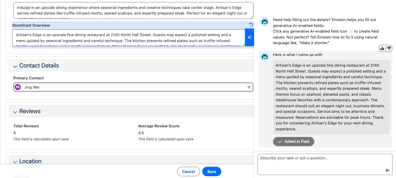 Click the Generate button (sparkles icon) next to the Storefront Overview input field, and watch Einstein generate a storefront overview.