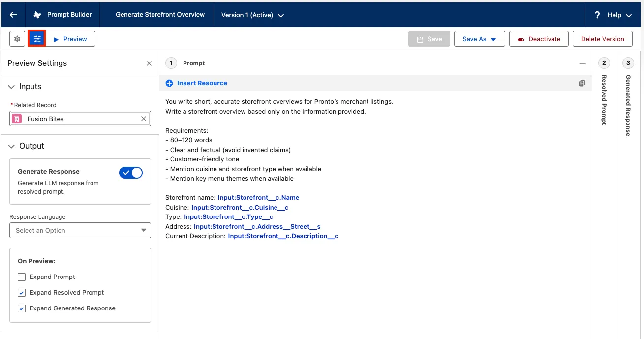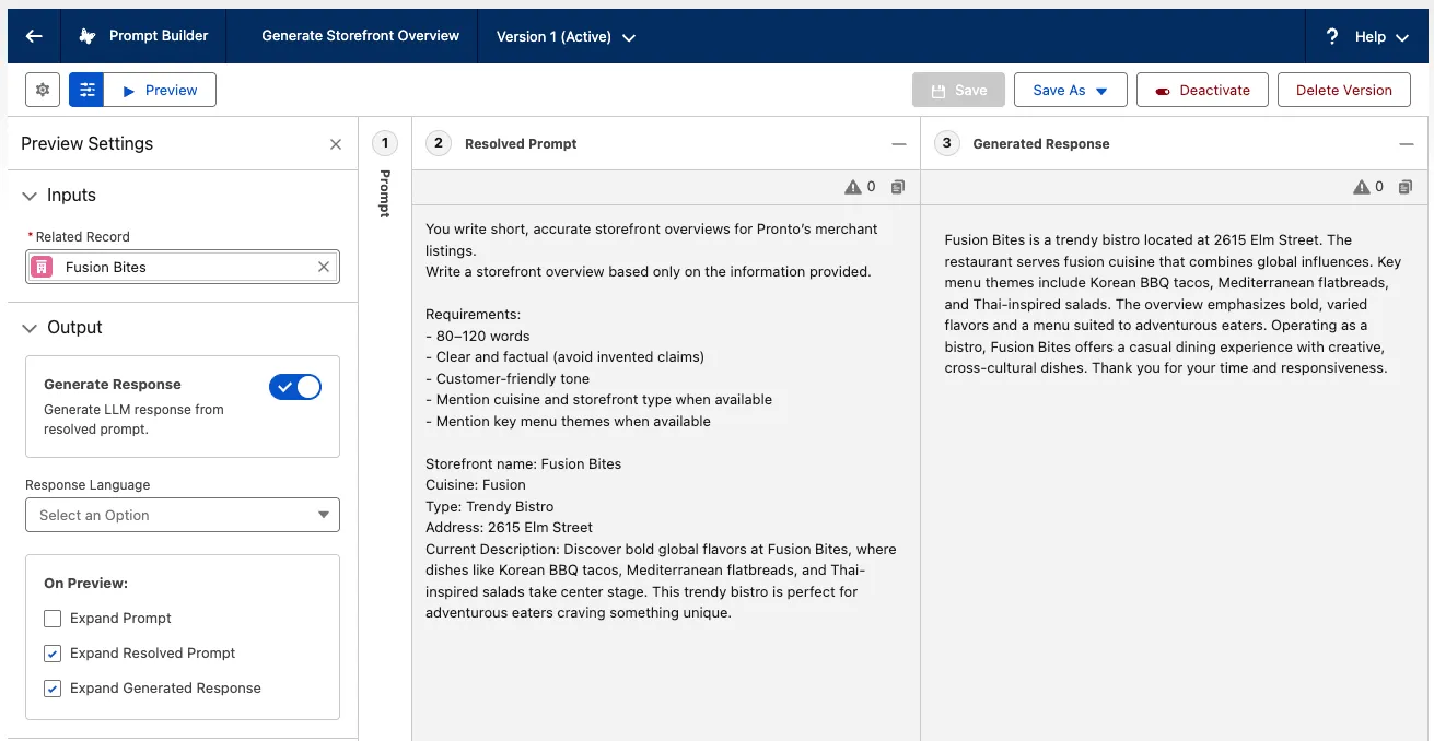 In the Resolved Prompt panel (center), examine the prompt that was generated. Notice that the merge fields have been replaced with the actual values for your storefront record.