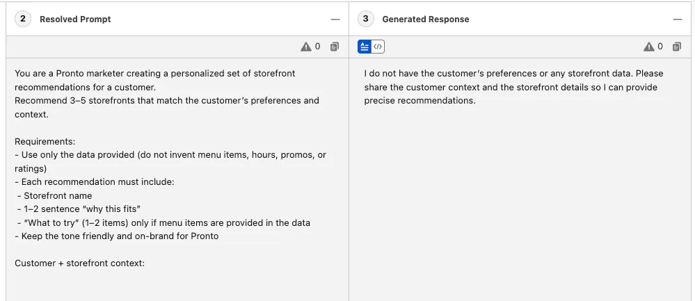In the Generated Response panel, examine the recommendations generated by the LLM. Now that you grounded the prompt in real data, the output should reference storefronts and menu items from the payload instead of making them up.