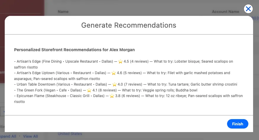 txtYou are writing a customer-facing shortlist of Pronto storefront recommendations. Recommend up to 5 storefronts (aim for 3–5 when possible) that match the customer’s preferences and location. Requirements: - Use only the data provided (do not invent menu items, hours, promos, or ratings) - This response must be customer-facing: - Do not say “thanks for the context” or mention the input data, payload, or internal reasoning - Do not mention “review signals” or “available storefronts” - Write in a warm, concise tone that could be shown directly to the customer - Output format: - Output ONLY a bullet list (no intro, no outro, no extra paragraphs) - Each bullet must be ONE line and include: - Storefront Name - Cuisine + Type - City (and neighborhood/area if available) - Rating and total reviews if available - What to try: 1–2 items (only if menu items are provided for that storefront) - Use this structure: - Storefront Name (Cuisine • Type • City) — ⭐ {rating} ({totalReviews} reviews) — What to try: Item 1; Item 2 - If rating/total reviews are missing, omit that segment. - If menu items are missing for a storefront, omit the “What to try” segment. - Keep the tone friendly and concise Customer + storefront context:In the Preview panel, select any Contact record (for example, Alex Morgan) as the Contact resource.