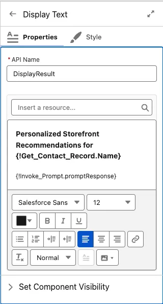 Field Value Label Invoke Prompt API Name Keep default Description Invoke the Generate Customer Recommendations Flex template Contact Select the Contact record from your Get Records element (remove any trailing dot that is automatically added) Add a Display Text component to the screen and set it to the output: