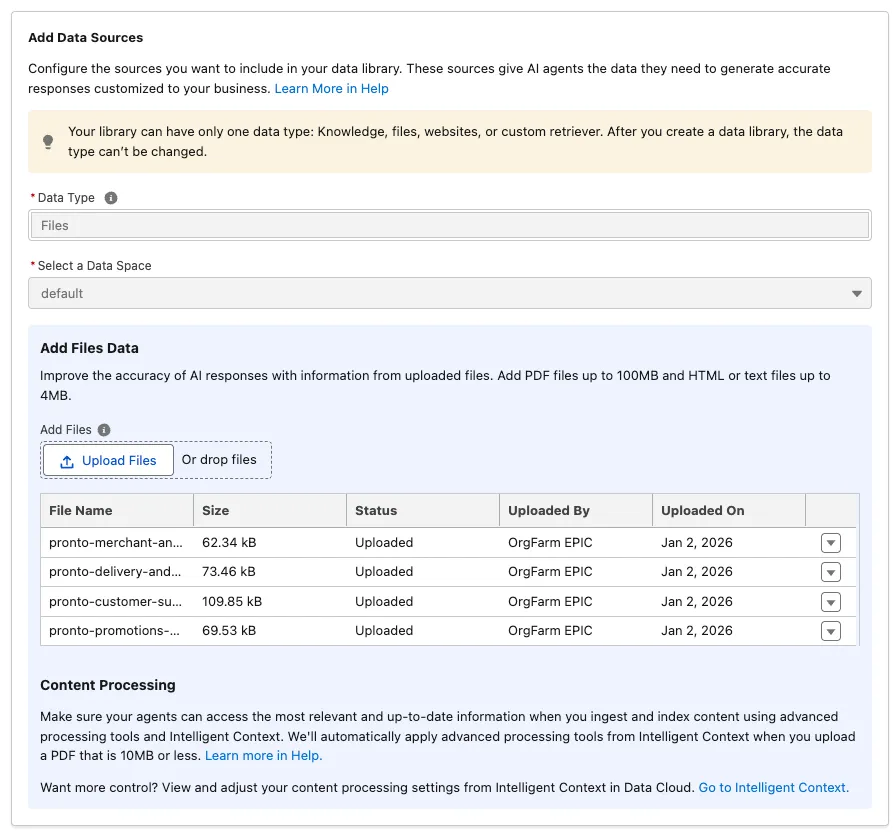 You’ll create an Einstein Data Library and a Search Retriever so later prompts and agents can retrieve relevant chunks for grounding.