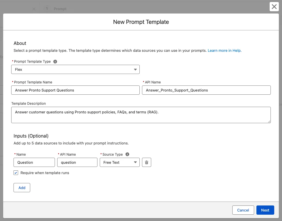 Parameter Value Prompt Template Type Flex Prompt Template Name Answer Pronto Support Questions API Name Keep default Template Description Answer customer questions using Pronto support policies, FAQs, and terms (RAG). Resource Name Question API Name questionObject Free Text Use the screenshot below to make sure that you entered the values correctly.