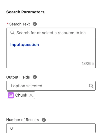 Field Value Search Text Free Text > Question Output Fields Chunk Number of Results 6 Use the screenshot below to make sure that you entered the values correctly.
