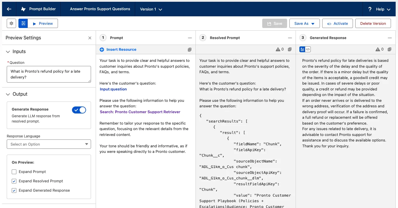 In this exercise, you’ll create and activate a Flex template in Prompt Builder that uses Einstein Search (RAG) to answer Pronto support questions grounded in the Pronto PDFs you ingested.