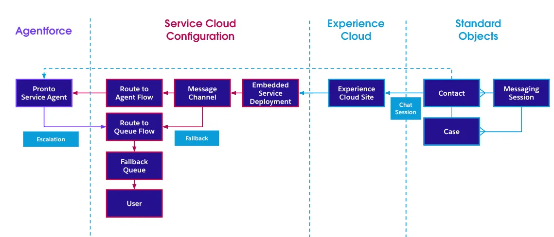 Use the diagram below to understand how Agentforce, Service Cloud, and Experience Cloud work together in the end-to-end experience.
