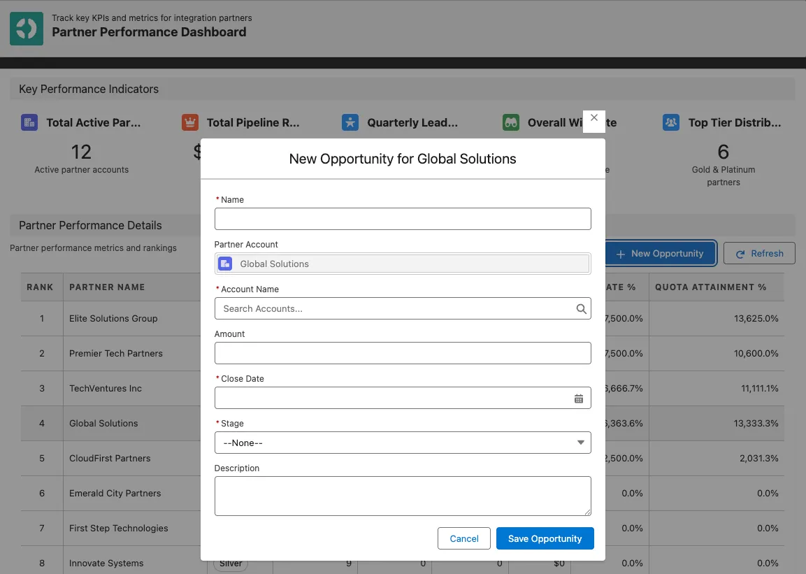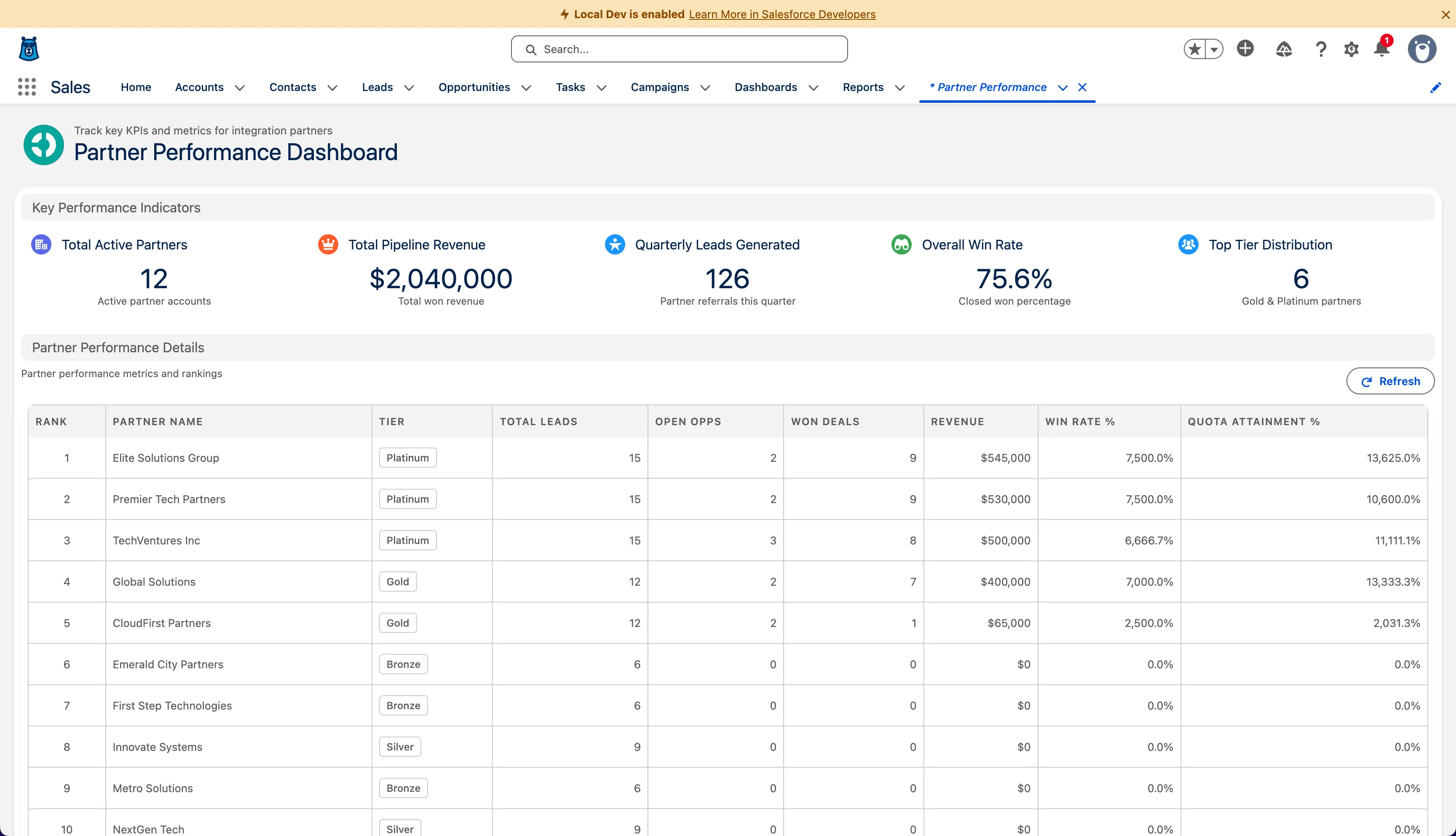 The Partner Management team needs visibility into the performance of their integration partners. Partners are represented as Accounts, and their sales activity is tracked in Leads and Opportunities. Leadership needs a single place to see KPIs across all partners, including revenue, pipeline, and win rates.