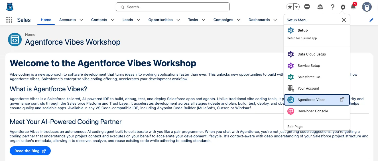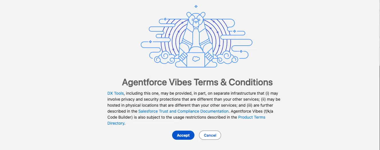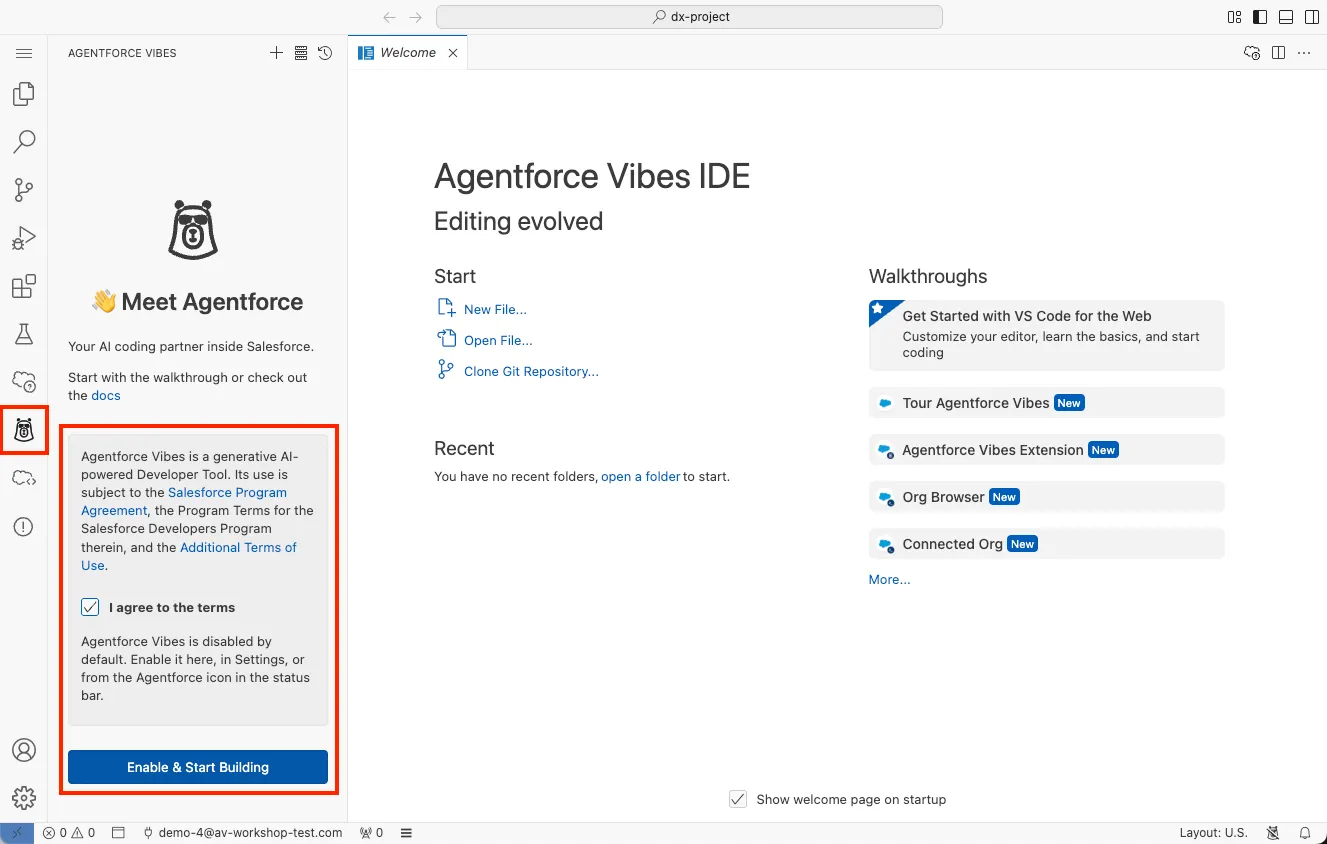 In this exercise, you launched Agentforce Vibes and activated it in your Salesforce org. You walked through the initial setup flow, enabled the agent, and confirmed that your development environment and sidebar were initialized correctly. With Vibes now running inside your IDE, you’re ready to begin exploring the tools and features that support AI-assisted development.