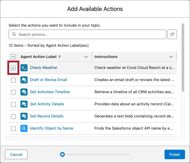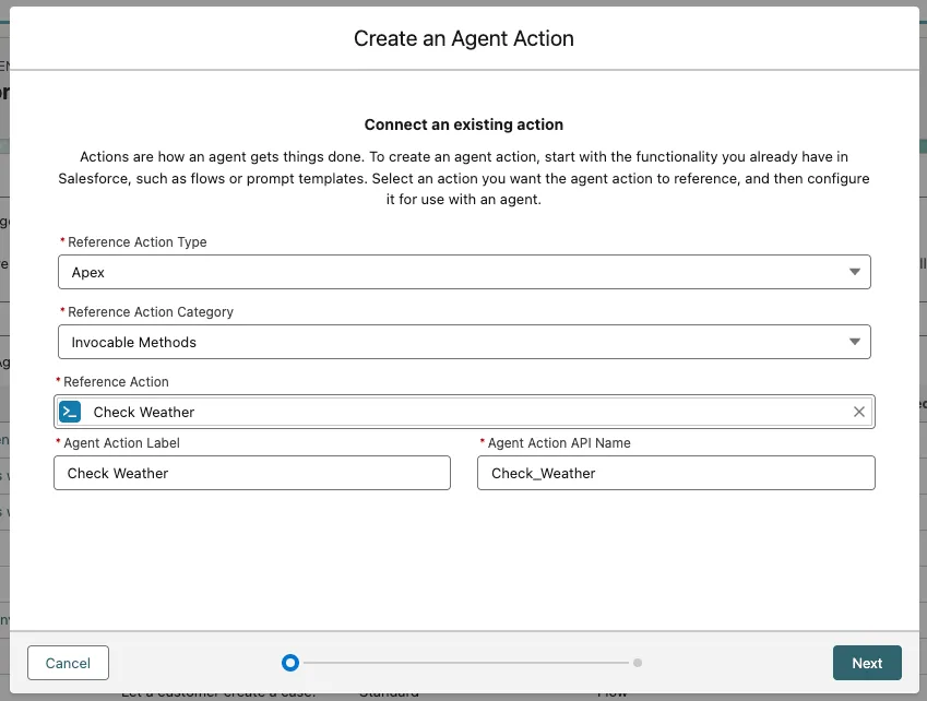 Field Value Reference Action Type Apex Reference Action Category Invocable Methods Reference Action Check Weather Agent Action Label Keep default Agent Action API Name Keep default