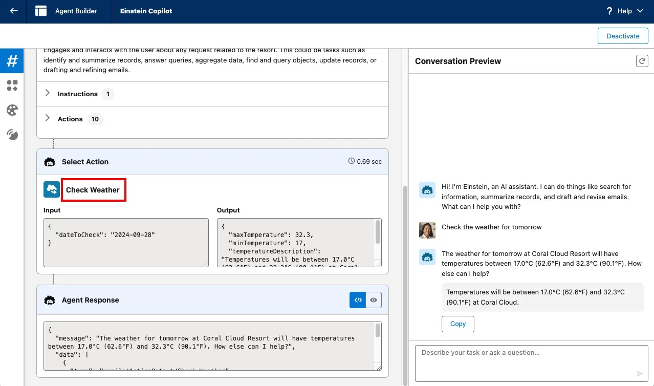 Coral Cloud Resorts front-desk employees need an easy way to check the weather, so that they can recommend experiences based on the weather forecast. In this exercise, you'll create a custom action using an Invocable Apex class that allows your agent to invoke a third-party weather API.