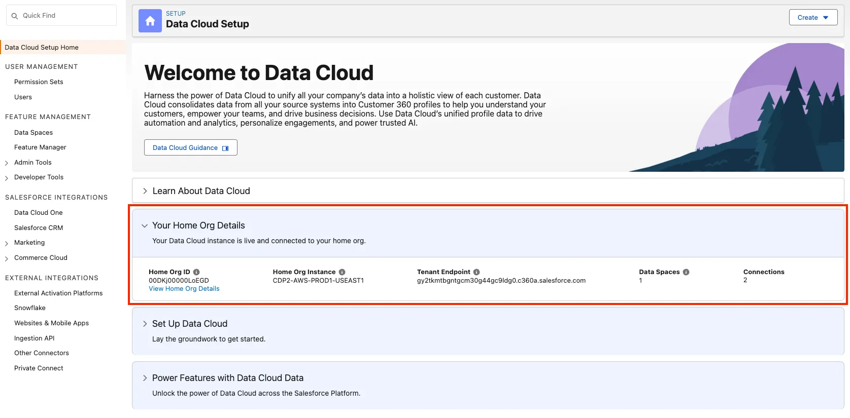 If you can see the section that displays Your Home Org Details, Then Data 360 has already been provisioned and you can move on to install the Coral Cloud Resorts Data Kit below.