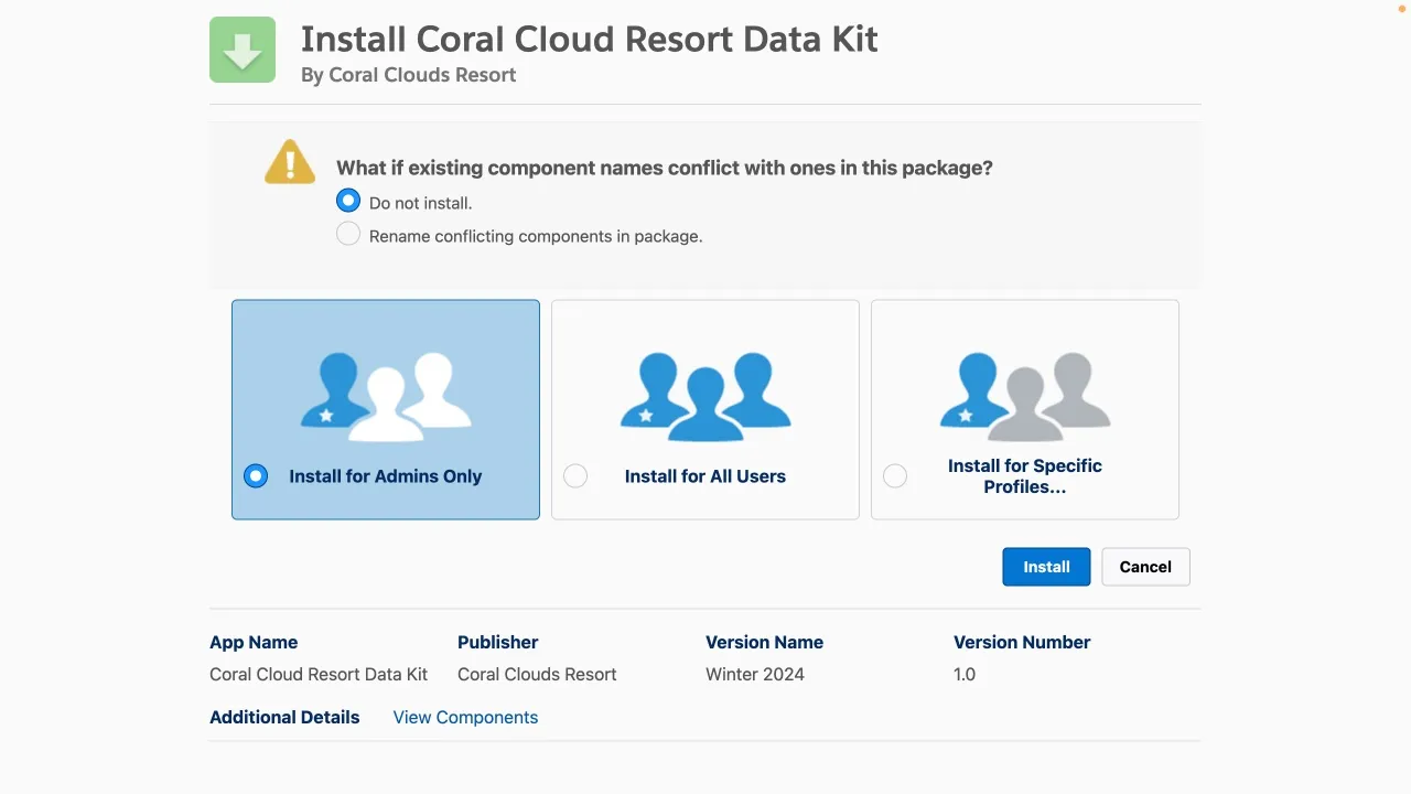 To install the Coral Cloud Resorts CRM Contacts Data Kit: