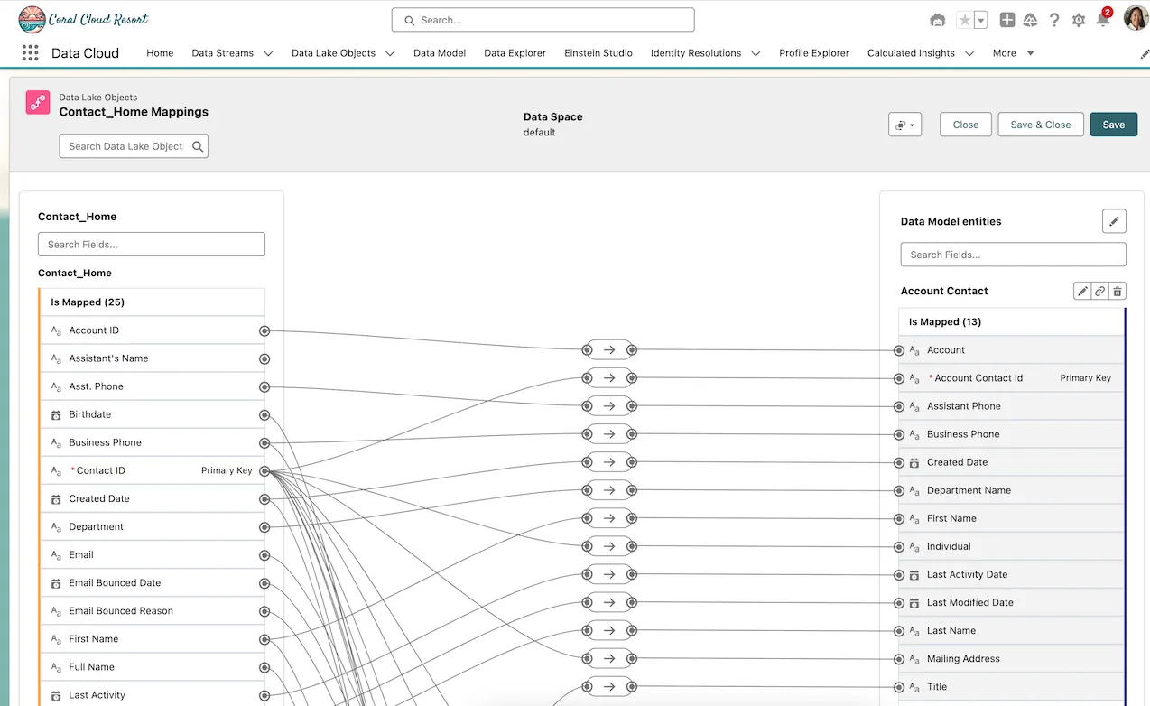 Review the Source object on the left-hand side: these are tshe fields of the Salesforce Contact object that you ingested into a data lake object (DLO).