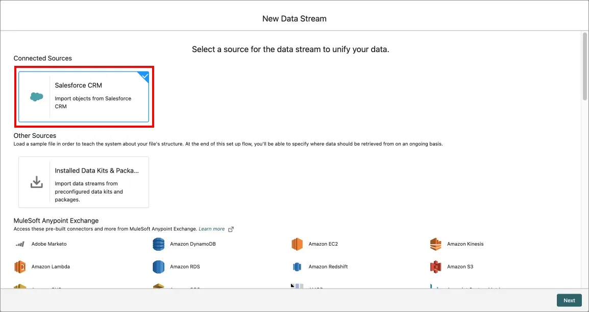 Under Connected Sources, select the Salesforce CRM connector, and click Next.