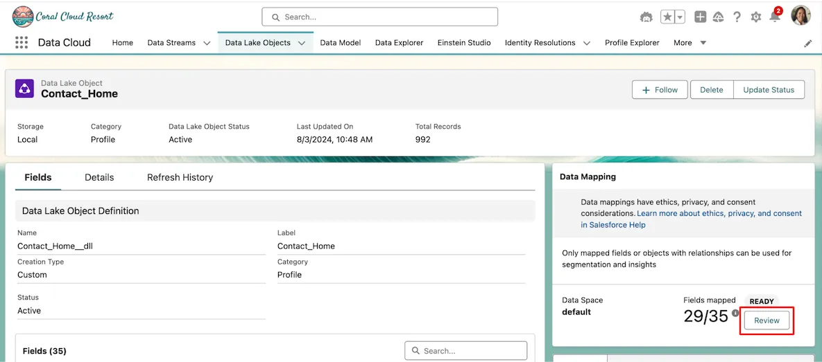 From the Contact_Home data lake object, click the Review button in the Data Mapping panel on the right.