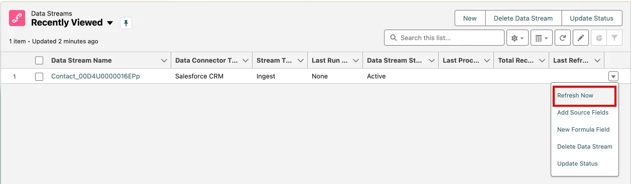 After the deployment, click the arrow down icon to the right of the Contact data stream row, and select Refresh Now.