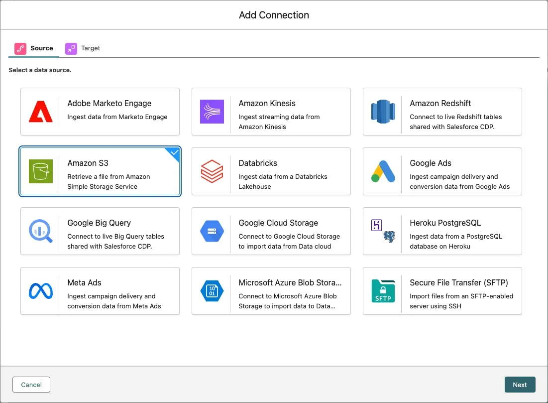 You can use s to seamlessly unify data from various enterprise systems. As an example, Coral Cloud Resorts stores guest and reservation data in Amazon S3. To ingest data from Amazon S3, you first need to create an Amazon S3 connection.