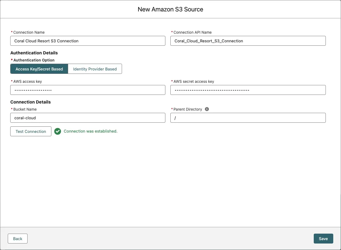 Field Value Connection Name Coral Cloud Resorts S3 ConnectionConnection API Name Keep default Authentication Option Access Key/Secret Based (default) AWS access key AKIA47CRZ7L5P7VBV3LDAWS secret access key PIVzypT/xl7EG9dwbv2tMOqoHpiPBV9AeEvZFvd9Bucket Name coral-cloudParent Directory Keep default value: /Click Test Connection to validate the connection.