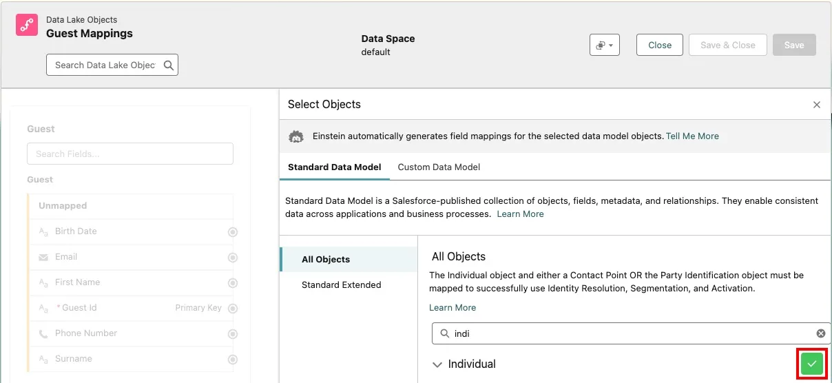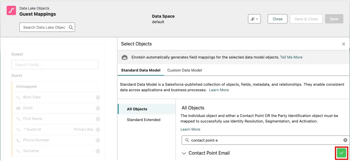 Make sure that you see the two data model objects you selected on the right-hand side: Contact Point Email and Individual. The First Name and Surname fields from the Guest DLO have been mapped automatically to the First Name and Last Name fields of the Individual DMO.