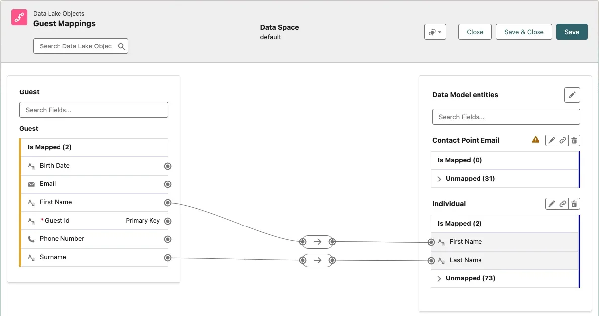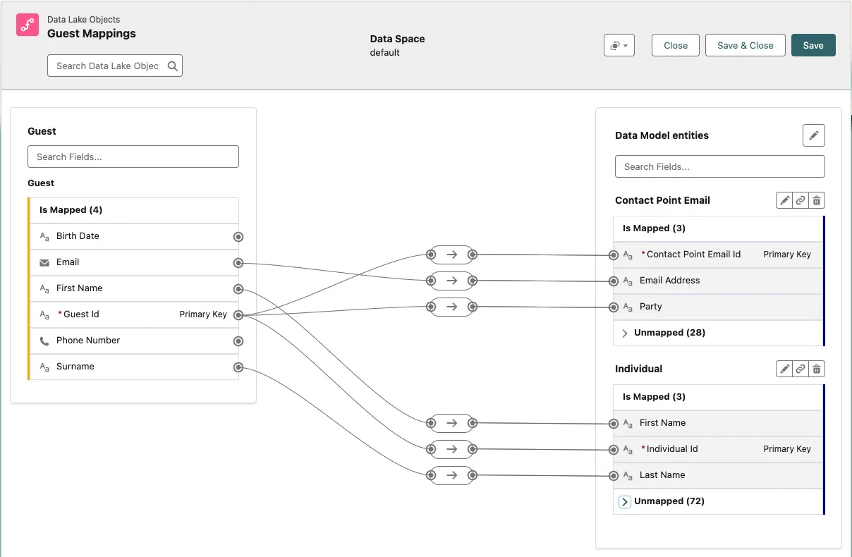 Data Lake Object DLO Field → Data Model Object DMO Field Guest Guest Id → Contact Point Email Contact Point Email Id Guest Guest Id → Contact Point Email Party Guest Email → Contact Point Email Email Address Guest Guest Id → Individual Individual Id Guest First Name → Individual First Name (mapped by default) Guest Surname → Individual Last Name (mapped by default) Make sure that your mappings are correct using the screenshot below as a reference.